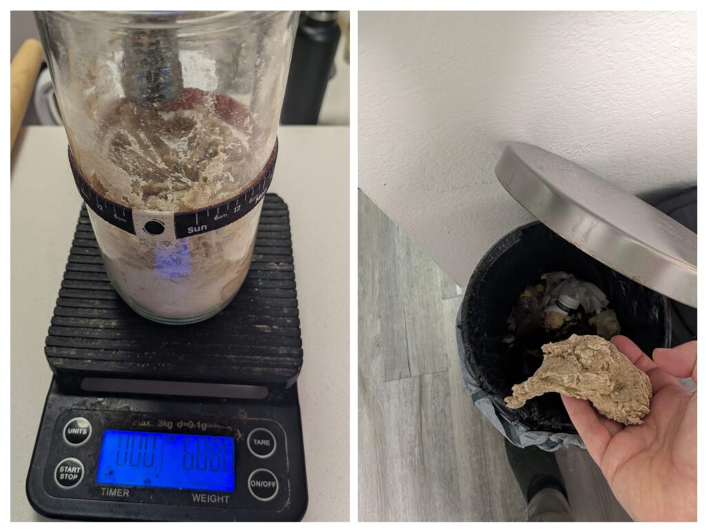 Start by discarding about half of your existing starter. This keeps your starter manageable and prevents it from growing too large. This is where it helps to know how much your jar weighs. My jar weighs about 400g and there are 688g of starter in it – so I threw away about 150g. This is sad and at the moment, there’s not much you can do about it. After you’ve established your starter, there are tons of fun things you can do with your discard aside from throwing it away.