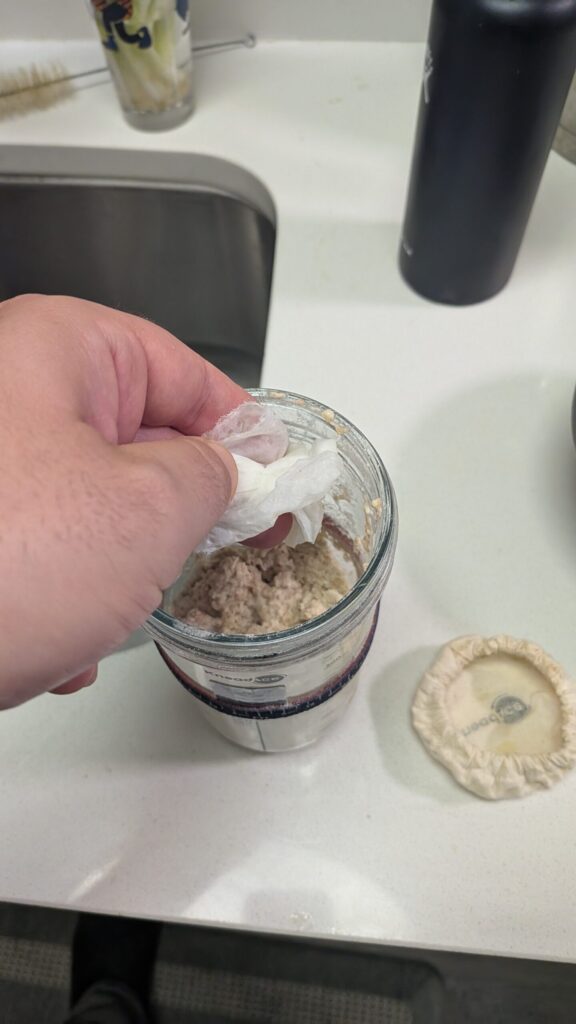 Next, you’ll want to clean the inside of your jar a little bit. This isn’t super important, but sourdough starter (especially the very stiff one we’re making) is one of the world’s stickiest substances and you’ll want to make sure a crust doesn’t form on your jar. To do this, just take a damp paper towel or rag and rub it against the inside of the starter. If you do this regularly, you won’t have to switch jars all the time or have to throw your jar away because it gets too gross (don’t ask me how I know).