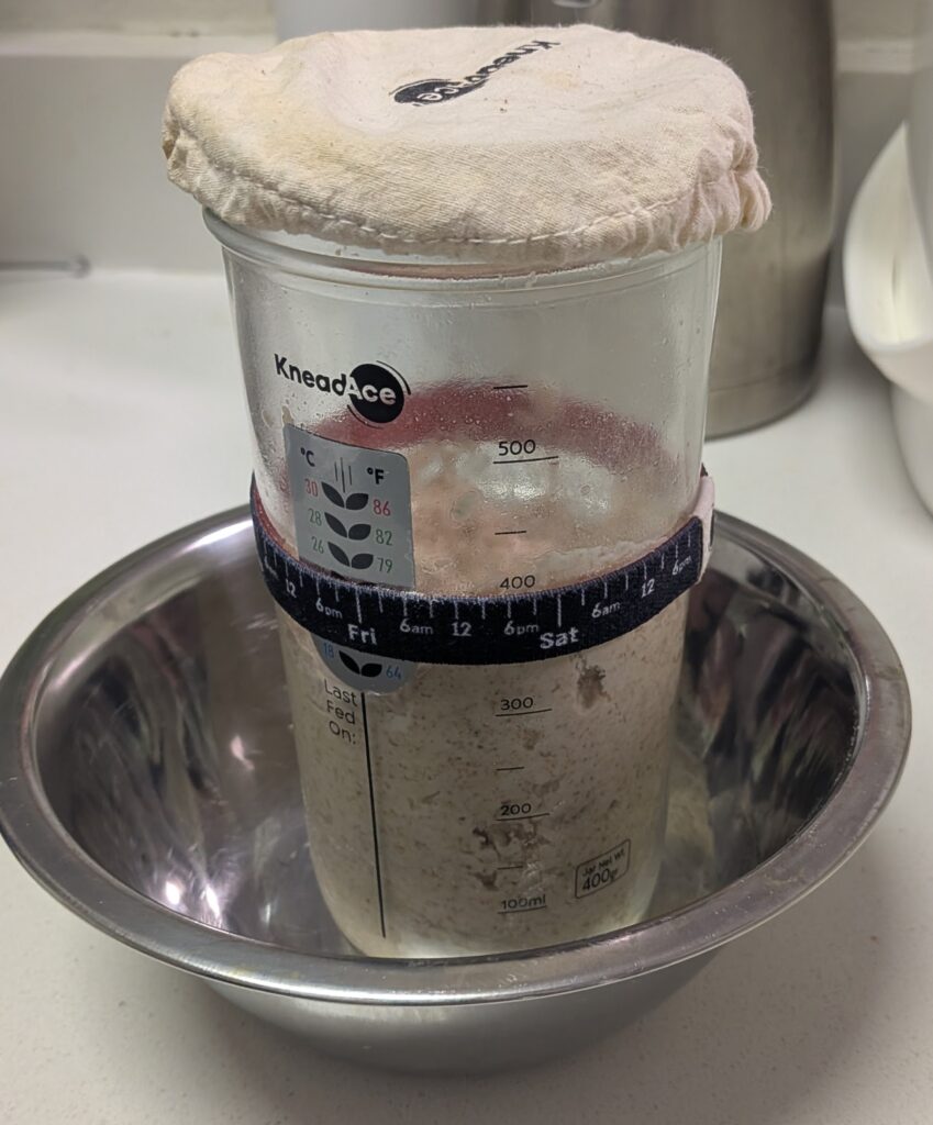 That’s it for now! We’ll do something like this for a few days (or, if you’re unlucky, more than a few) until the starter starts to rise and fall regularly.
