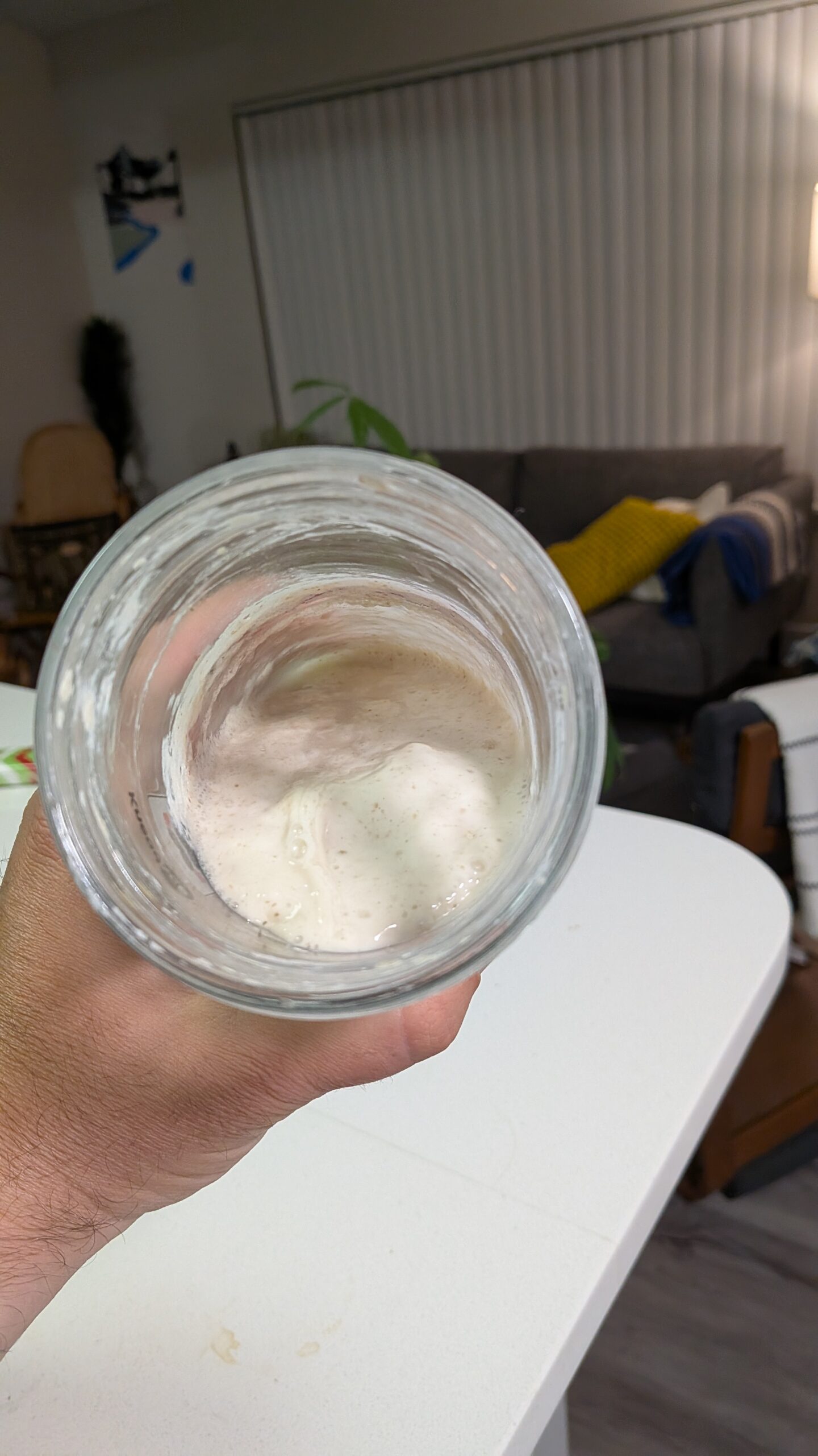 I’m back from vacation, so I got my starter back to life! First, I took it out of the fridge and let it sit on the counter for a few hours to warm up. Then I threw away half and added a new 1:1 mixture of 50g water and 50g flour. I mixed it all together, cleaned up the sides, and let it out on the counter. That’s it for bringing it back to life!