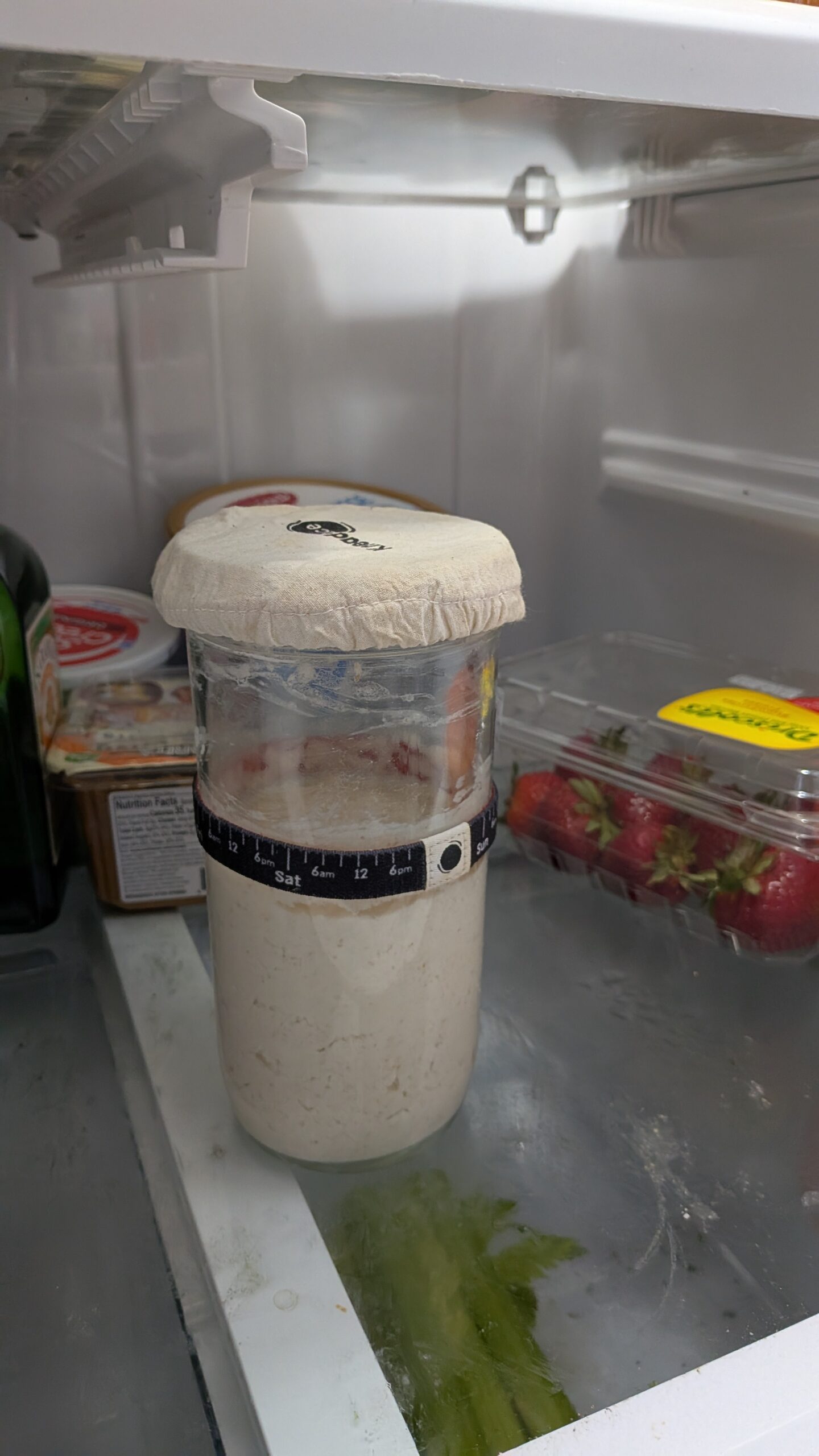 Now that we’re in the beginning phases of feeding the starter culture that we actually want, I have a small problem – I’m going out of town for a few days! Thankfully, unlike a pet, a sourdough starter can be left alone for a few days without feeding. You just need to put it in the fridge. This slows down the starter’s metabolism and it should come back to life when I’m back.